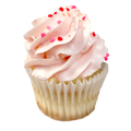 Vanilla cake filled with real organic strawberry filling, topped with strawberry buttercream, and topped with sprinkles.