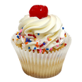 A light and delicious vanilla cake, vanilla buttercream, topped with chocolate hot fudge and a cherry on top.